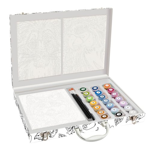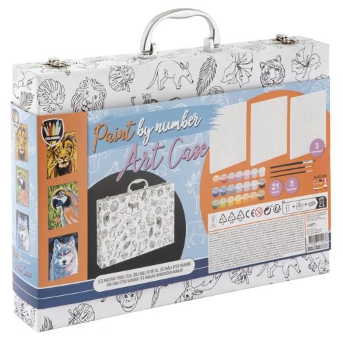 Kufřík s malováním podle čísel obsahuje předtištěné obrázky na plátně (3 ks – lev, papoušek a vlk) s čísly, 21 očíslovaných barev, 2 kulaté a 1 plochý štětec. Velikost kufříku 35×25 cm.