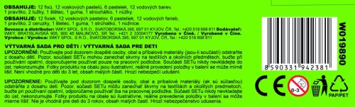 Kufřík výtvarných potřeb 50 ks Krteček. Obsahuje: 12 fixů, 12 voskových pastelů, 6 pastelek, 12 vodových barev, 1 pravítko, 2 tužky, 1 štětec, 1 guma, 1 strouhátko, 1 nůžky.