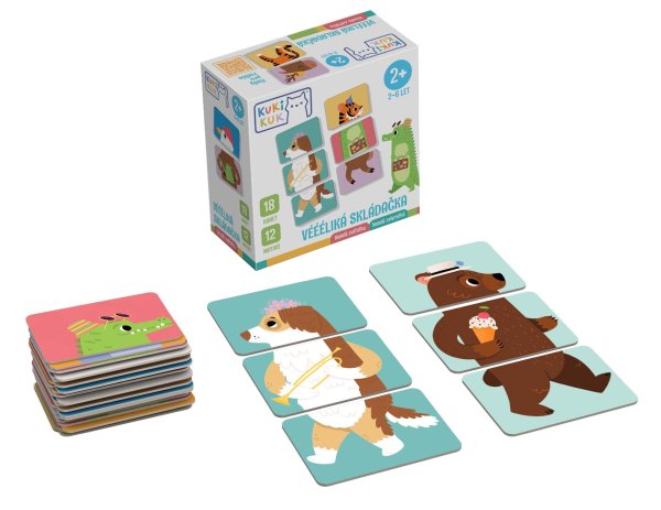 Kreativní hra Véééliká skládačka Veselá zvířátka je určena ke vzdělávání nejen pro batolata, ale také pro předškoláky. Zvířátka se skládají ze tří kartiček: hlava – trup – nohy. Sada obsahuje 18 oboustranných karet, které zobrazují celkem 12 různých zvířátek, ze kterých je možno také vytvořit nepřeberné množství legračních kombinací.