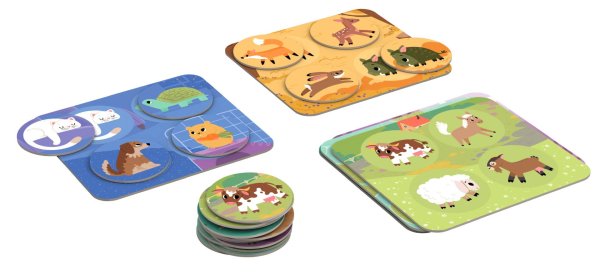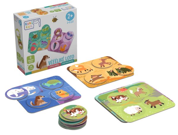 Véééliké loto Zvířecí pelíšky, je oblíbená zábavná dětská hra, která představí batolatům 24 zvířátek v jejich pelíšcích: na louce, v lese, ve vodě... Hra obsahuje 24 velkých kulatých žetonů a šest hracích desek ze 2 mm silného kartonu.