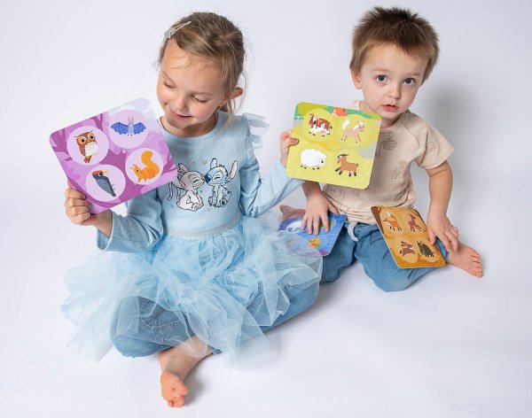 Podívejte se na první desku společně. Ukažte na zvíře prstem a pojmenujte ho. Cílem je, aby dítě správně pojmenovalo všechna zvířátka. Můžete zkusit napodobit zvuky, které zvíře vydává: kočka mňouká, pejsek štěká, žába kváká a kuňká. Svým pohybem mohou zvířátka vydávat také rozličné zvuky: včelka bzučí, rybka šplouchá, koník klape kopýtky atp.