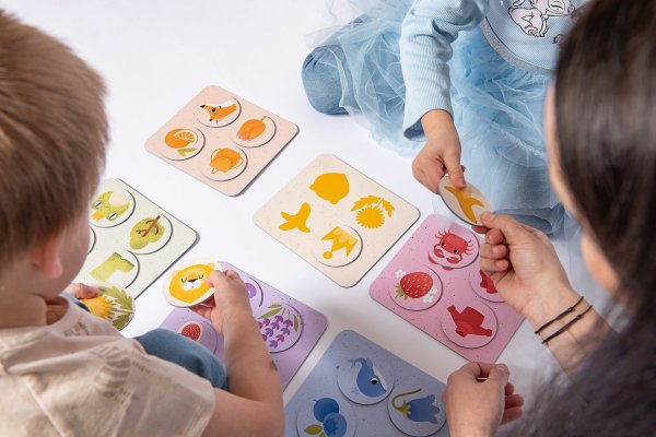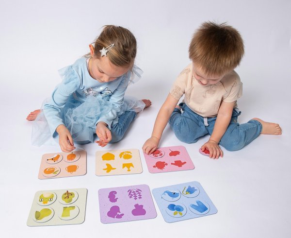 Položte vybranou desku a odpovídající žetony před dítě. Dítě má za úkol umísťovat žetony na správná místa podle barev a příslušných stínů – obrysů. Přidejte na plochu víc žetonů. Požádejte své dítě, aby přikládalo žetony na správná místa na hracích deskách. Cílem je vyskládat všechny žetony na hrací desky a docílit, aby dítě správně položilo všechny žetony.