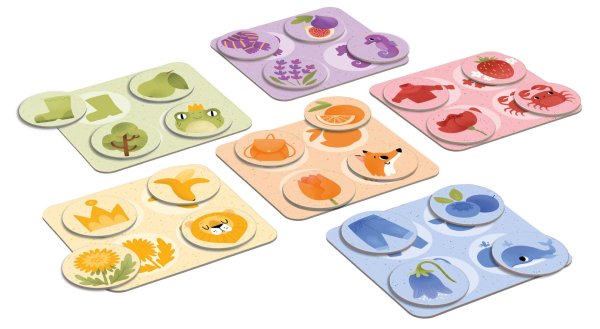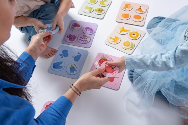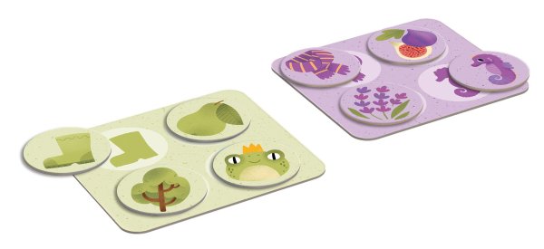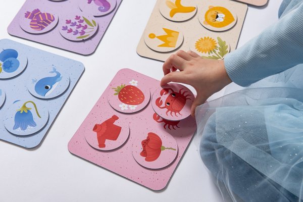 Přikládejte k desce příslušné žetony. Vysvětlete dítěti souvislost obrázku na žetonu a jeho stínem na hrací desce. Pojmenujte základní barvu desky a jejich obrázků. Požadujte po dítěti, aby popsalo pojmenovaný obrázek: zvířátko – kde žije, květina – kde roste, ovoce – jak chutná, oblečení – kdy se používá, z jakého je materiálu. Zkuste vyjmenovat další věci nebo rostliny a zvířátka, která mají stejnou barvu a mohly být na stejné hrací desce.