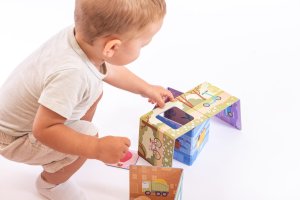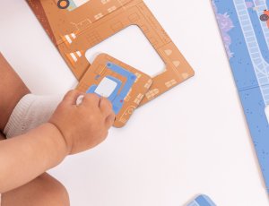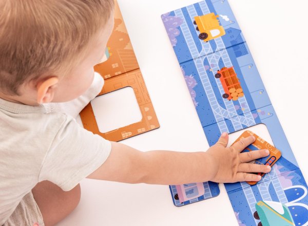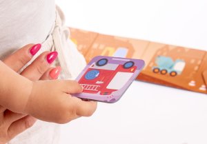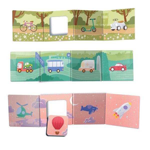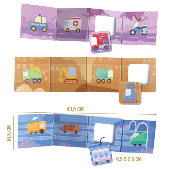 Tři oboustranná harmoniková leporela s okénky a čtvercovými vkládacími žetony. Na každém leporelu najdete čtyři vozidla vždy z jednoho tematického světa - staveniště, záchranáři, železnice atd. Celkem šest prostředí a 24 vozidel.