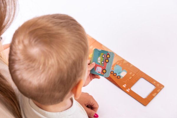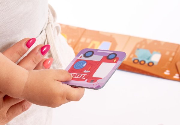 Úkol "najdi a vlož" - dítě vybere správné vozidlo a umístí ho do příběhu (stavba, dálnice, železnice…)