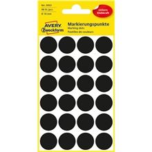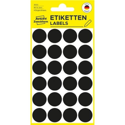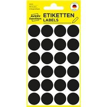 Kulaté značkovací etikety černé barvy Vhodné pro ruční popis Barva: černá Průměr: 18 mm Počet etiket na archu: 24 kusů Počet archů: 4 kusy Počet etiket v balení: 96 kusů
