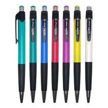 Stiskací kuličkové pero v elegantním dvoubarevném provedení Příjemný pogumovaný úchop pro komfortní držení a psaní Stříbrná stiskací mechanika s barevnou koncovkou Tištěné logo na klipu Vyrobeno z 73 …