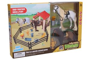 Kůň 2 ks s ohradou. Velikost koně 14cm. Obsahuje 2 koně, ohradu a přístřešek pro koně, příslušenství k péči o koně. Návod ke složení ohrady a přístřešku na obale.