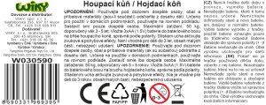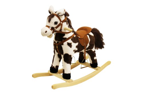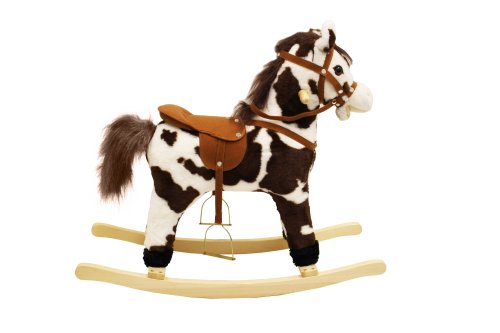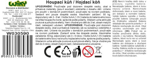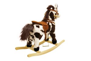 Kůň houpací s efekty strakatý. Rozměry 71x30x62 cm. Vydává zvukové efekty, hýbe tlamou a ocasem. Aktivace tlačítkem v uchu. Přihrádka na baterie se nachází na břiše koně. 3xAA baterie nejsou součástí.