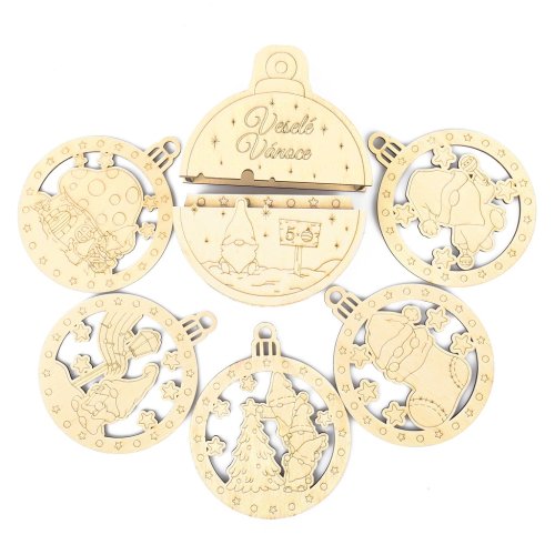 Rozměry balení: 8,1x3,2x15 cm Rozměry: ⌀ 7 cm Materiál: topolové dřevo Obsahuje 5 ks vánočních ozdob v krabičce