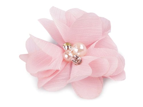 Textilní květ působí jemně a romanticky. V jeho středu jsou našité plastové korálky a broušené kamínky, které se efektně třpytí. Nedoporučujeme prát, aby zůstala zachována původní kvalita výrobku. Použití: Květ můžete našít jako ozdobu na společenské šaty, halenky, trička nebo svetry. Je vhodný i na zdobení klobouků, čepic a čelenek do vlasů. Můžete ho také pomocí lepidla přilepit na brožový můstek a vytvořit zajímavý šperk. U bílé barvy se může lišit barva kovu (platina, stříbrná).