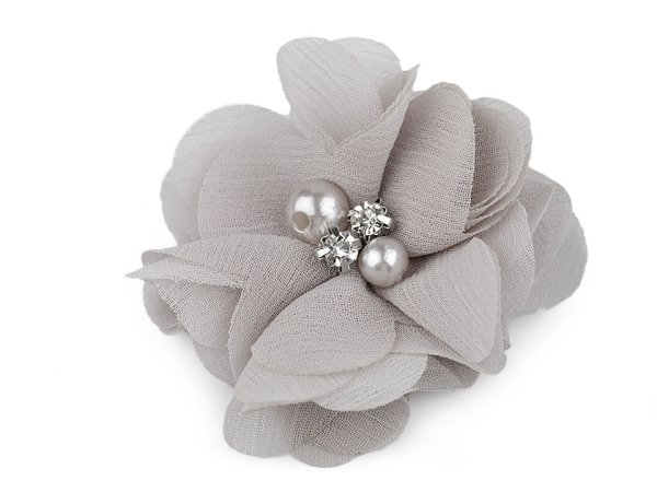 Textilní květ působí jemně a romanticky. V jeho středu jsou našité plastové korálky a broušené kamínky, které se efektně třpytí. Nedoporučujeme prát, aby zůstala zachována původní kvalita výrobku. Použití: Květ můžete našít jako ozdobu na společenské šaty, halenky, trička nebo svetry. Je vhodný i na zdobení klobouků, čepic a čelenek do vlasů. Můžete ho také pomocí lepidla přilepit na brožový můstek a vytvořit zajímavý šperk. [U bílé barvy se může lišit barva kovu (platina, stříbrná).]