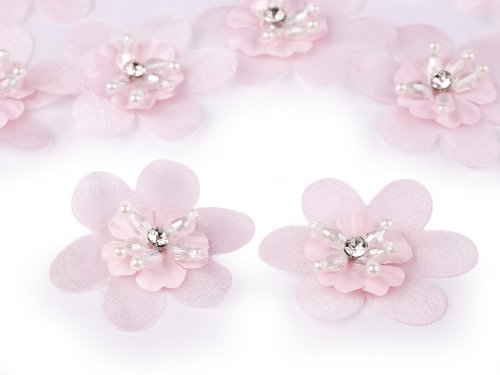 Elegantní květ se zdobeným středem je složený ze 2 vrstev. Spodní část květu je tuhá organza, horní část je zesílená a tvarovaná. Střed je ručně dozdobený broušeným kamínkem v kotlíku a korálky, působí velice romanticky. Broušený kamínek ve středu květu dodává třpytivý efekt, zatímco korálky rozprostřené po okvětí zajišťují bohatý a výrazný vzhled. Použití: Květ můžete našít či nalepit na svetříky, halenky, šaty, kabátky, psaníčka, tašky nebo vlasové ozdoby, klobouky a čepice.