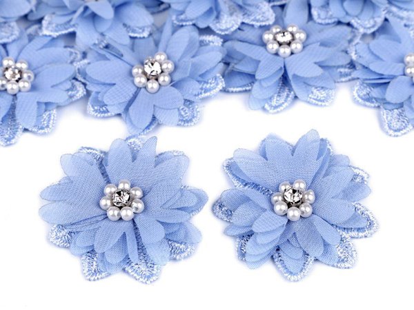 Květ s broušeným kamínkem a korálky k našití a nalepení Ø5 cm - modrá světlá (10 ks)