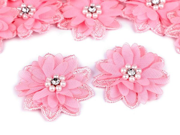 Květ s broušeným kamínkem a korálky k našití a nalepení Ø5 cm - růžová (10 ks)