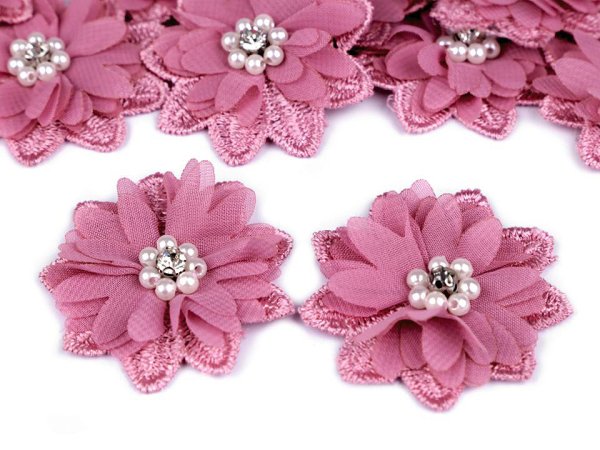 Něžný textilní květ je zhotovený z krajkového základu a dalších vrstev, které jsou šifónové. Jeho střed zdobí korálky a třpytivý kamínek. Květy můžete našít či nalepit na svetříky, halenky, šaty, kabátky, psaníčka, tašky nebo klobouky a čepice. Je vhodný i na tvorbu broží a různých vlasových ozdob.