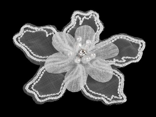 Zdobný květ je složený ze 2 vrstev: spodní část květu je monofilová se zesílenými vyšívanými okraji a působí velmi romanticky. Druhou vrstvu tvoří jednoduchý květ z organzy. Střed květu zdobí našité broušené korálky, perličky a broušený kamínek. Použití: Květ můžete našít či nalepit na svetříky, halenky, šaty, kabátky, psaníčka, tašky nebo vlasové ozdoby, klobouky a čepice.
