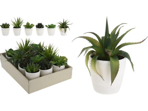 Dekorace umělá SUKULENT se 6 autenticky vypadajícími rostlinami, zasazená do bílého květináče.
