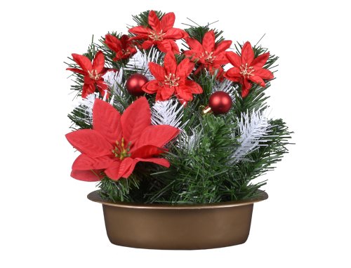 Vazba z umělých květin. Aranžmá z umělých květin imitujících vánoční hvězdy je umístěna v nízké nádobě. Vazba je dozdobena bílou a zelenou jehličinou a vánočními ozdobami. Vhodná sezóna: vánoce. Velikost: 25 cm. Barva: červená.