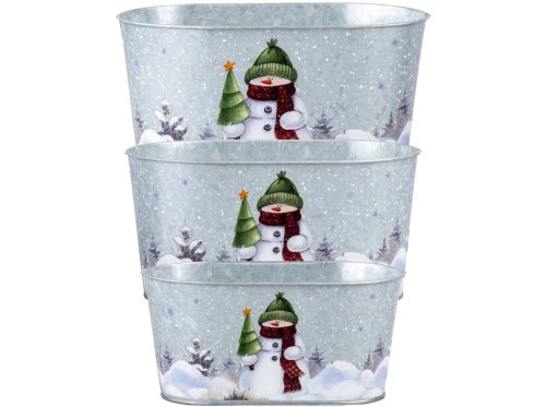 Tato sada tří oválných plechových květináčů s motivem Sněhuláka je ideální pro zimní dekorace a vánoční aranžmá. Barevný design přináší do vašeho domova veselou a slavnostní atmosféru. Květináče lze použít samostatně nebo jako dekorativní set.