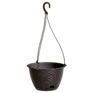 Plastový závěsný květník s připevněnou podmiskou a plastovým hákem k zavěšení. Barva: antracitová. Průměr: 22 cm, výška: 14 cm.