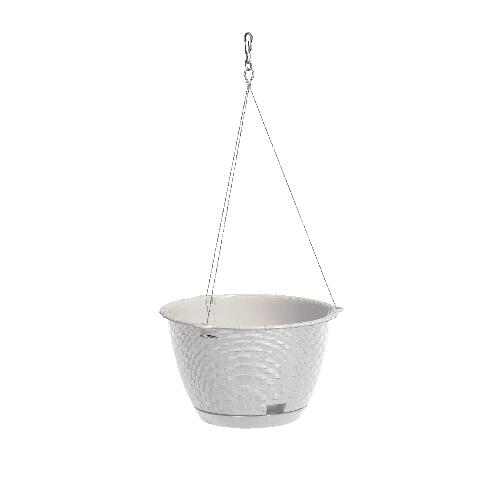 Plastový závěsný květník s připevněnou podmiskou a plastovým hákem k zavěšení. Barva: bílá. Průměr: 22 cm, výška: 14 cm.