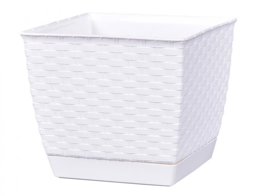 Hranatý plastový obal na květník věrně imituje ratanový výplet. Elegantní motiv je vhodný do interiéru, na terasy i balkóny. Barva: bílá. Šířka: 19 cm, výška: 16 cm, hloubka: 19 cm.