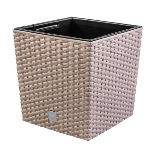 Hranatý plastový obal na květník s texturou imitující ratanový výplet. Tento obal je skvělým doplňkem stylových interiérů. Je vhodný do interiéru i exteriéru, je odolný vůči UV záření. Součástí je černá vnitřní vložka. Barva: hnědo šedá. Rozměry: 26 x 26 cm, výška: 27 cm.