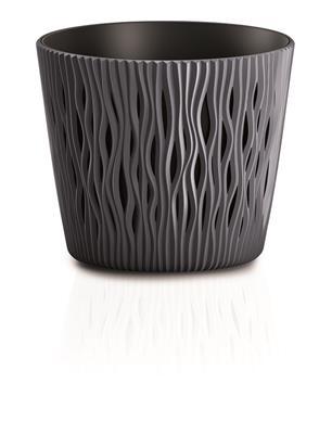 Plastový matný obal na květník se zvlněnými vertikálními drážkami se vzhledem pouštního písku. Je vhodný do interiéru i venkovních prostor - je odolný vůči UV záření. Šířka: 19 cm, výška: 17 cm.