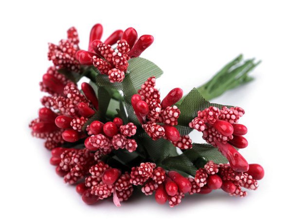 Bobulky drží na kovovém drátku, který je obalený floristickou páskou. Na jednom drátku je malý trs složený z pestíků, bobulek a kališního lístku. Použití: Bobulky vyniknou v umělých květech, věncích i dekoračních vazbách. Můžete je také použít jako pestíky při výrobě květin z foamiranu. Jedinečně doplní květinové věnečky do vlasů, fascinátory a čelenky. Jeden svazek obsahuje 12 kusů.