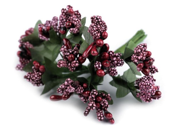 Bobulky drží na kovovém drátku, který je obalený floristickou páskou. Na jednom drátku je malý trs složený z pestíků, bobulek a kališního lístku. Použití: Bobulky vyniknou v umělých květech, věncích i dekoračních vazbách. Můžete je také použít jako pestíky při výrobě květin z foamiranu. Jedinečně doplní květinové věnečky do vlasů, fascinátory a čelenky. Jeden svazek obsahuje 12 kusů.