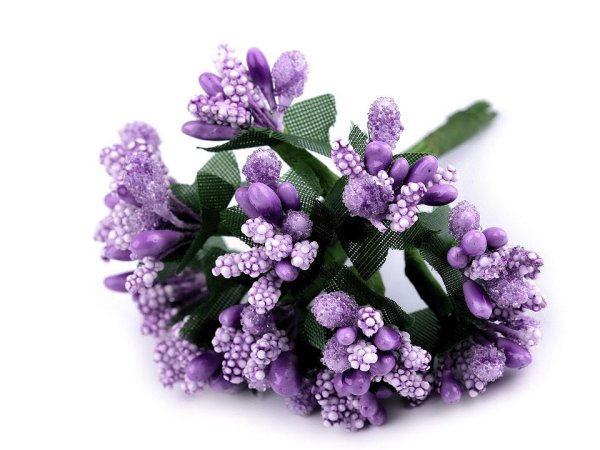 Bobulky drží na kovovém drátku, který je obalený floristickou páskou. Na jednom drátku je malý trs složený z pestíků, bobulek a kališního lístku. Použití: Bobulky vyniknou v umělých květech, věncích i dekoračních vazbách. Můžete je také použít jako pestíky při výrobě květin z foamiranu. Jedinečně doplní květinové věnečky do vlasů, fascinátory a čelenky. Jeden svazek obsahuje 12 kusů.