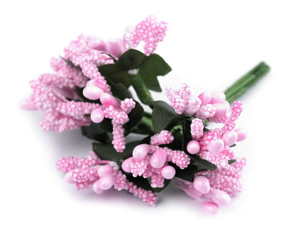 Bobulky drží na kovovém drátku, který je obalený floristickou páskou. Na jednom drátku je malý trs složený z pestíků, bobulek a kališního lístku. Použití: Bobulky vyniknou v umělých květech, věncích i dekoračních vazbách. Můžete je také použít jako pestíky při výrobě květin z foamiranu. Jedinečně doplní květinové věnečky do vlasů, fascinátory a čelenky. Jeden svazek obsahuje 12 kusů.