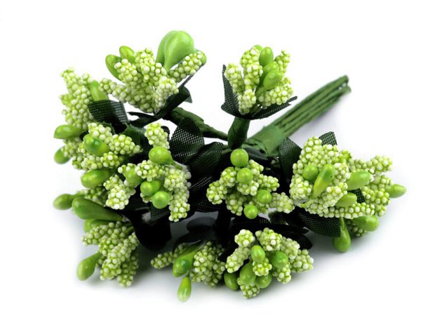 Bobulky drží na kovovém drátku, který je obalený floristickou páskou. Na jednom drátku je malý trs složený z pestíků, bobulek a kališního lístku. Použití: Bobulky vyniknou v umělých květech, věncích i dekoračních vazbách. Můžete je také použít jako pestíky při výrobě květin z foamiranu. Jedinečně doplní květinové věnečky do vlasů, fascinátory a čelenky. Jeden svazek obsahuje 12 kusů.
