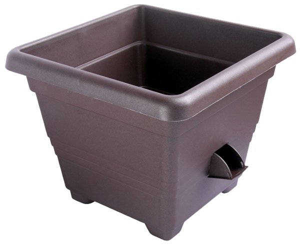 Květník čtvercového půdorysu s hladkým povrchem a nožičkami umožňujícími odtok vody. Kromě knotu obsahuje okénko na zalévání, k odtoku přebytečné vody při dešti a přístupu vzduchu ke kořenům. Rozměry: 25 x 25 cm, výška: 20 cm.
