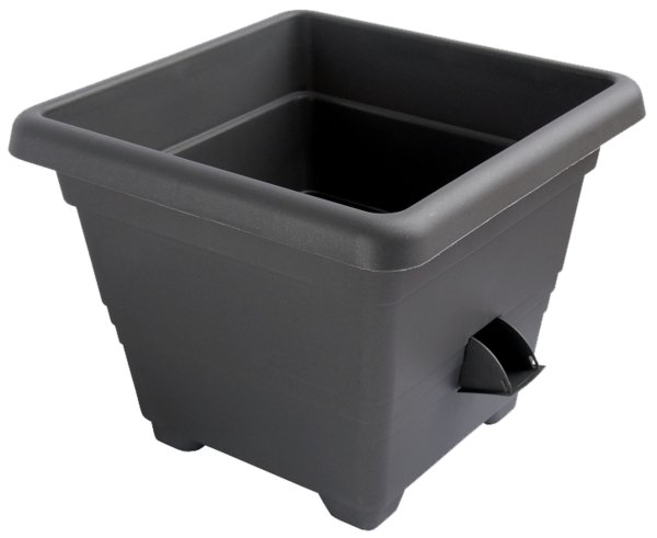 Květník čtvercového půdorysu s hladkým povrchem a nožičkami umožňujícími odtok vody. Kromě knotu obsahuje okénko na zalévání, k odtoku přebytečné vody při dešti a přístupu vzduchu ke kořenům. Rozměry: 30 x 30 cm, výška: 24 cm.