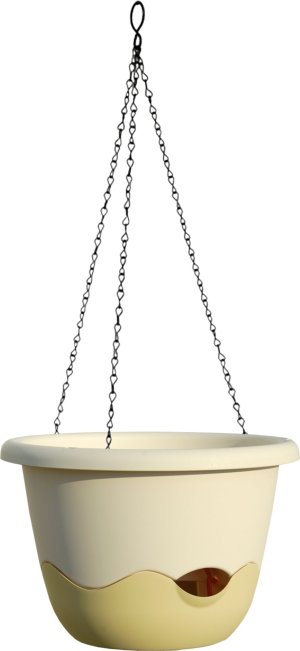 Plastový samozavlažovací květník v moderním dvoubarevném provedení. Součástí je kovový řetízek pro snadné zavěšení, knot, zalévací/přepadový otvor a hladinoměr. Šířka: 30 cm, výška: 20 cm.