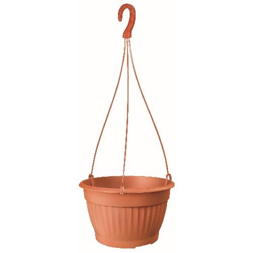Plastový v půdorysu kulatý jemně kónický závěsný, samozavlažovací květináč v barvě terakoty v části s vylisovanými pruhy, vedenými vertikálně. Horní okraj má širší, ohnutý směrem ven. Používá se k zavěšení s vysazenými převislými rostlinami v interiéru i v exteriéru. Rozměry: d. 29 x v. 18,5cm.