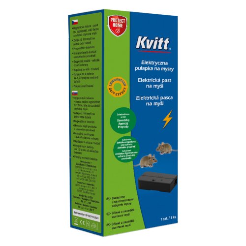 Elektrická past na myši Kvitt je velmi účinný a rychlý způsob kontroly myší. Myši jsou do pasti přilákány pomocí vložené návnady. Když se myš dotkne kovové destičky uvnitř, je usmrcena elektrickým proudem. Myši rychle a bezbolestně uhynou. Mrtvé myši lze snadno odstranit, aniž byste se jich dotkli. Elektrická past má řadu bezpečnostních prvků pro uživatele. Past funguje jak na napájecí kabel, který je součástí balení, tak na baterie (baterie nejsou součástí balení). Elektrické pasti jsou ve srovnání s jinými metodami hubení hlodavců účinnější a hygieničtější. Elektrická past na myši Kvitt je určena pro použití v interiéru a lze do ní chytit až 100 myší, než je třeba vyměnit baterie. Pro použití v interiéru.
