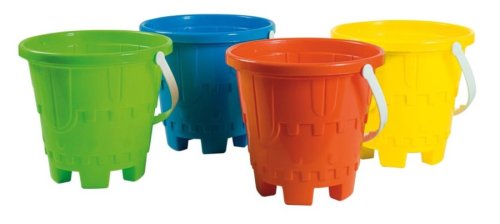 Barevný plastový kyblík na nožkách vhodný na přenášení písku a vody. Může být použit i jako bábovička hradní věže.