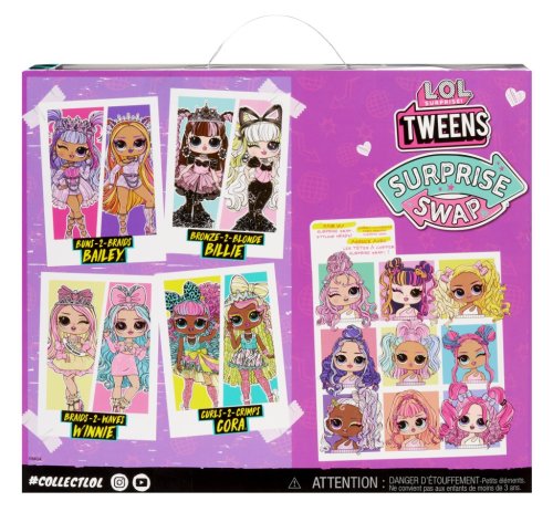 Získej 4 nové divoké a stylové Tweens panenky. V balení s panenkou najdeš mini česací hlavu a různé vlasové doplňky, díky kterým vykouzlíš dokonalý účes. Panence můžeš vyměnit hlavu podle toho, jaký styl se bude hodit k jejímu outfitu. Česací hlava má jiný výraz tváře, jinak barevné a jinak upravené vlasy. Můžeš kombinovat mezi všemi Swap Tweens panenkami.