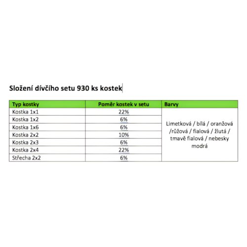 Sada základních stavebních kostek v pestrých dívčích barvách, které probouzí fantazii ke stavbě neobyčejných sídel, zámků, domků a pokojů. Baleno v průhledném plastovém sáčku. Hlavní vlastnosti:7 druhů kostek, 8 barevkompatibilní s dalšími stavebnicemi Certifikát „Bezpečné hračky“ je vydáván Institutem pro testování a certifikaci, a. s. (ITC), nezávislou společností s mezinárodní působností, která poskytuje odborné služby v oblasti zkoušení a certifikace hraček více než 15 let. Označuje výrobky skutečně pečlivě posouzené z hlediska všech možných rizik. Jeho vydání je podmíněno pravidlenými kontrolami dodavatelů, procesu výroby a zkouškami výrobků, které zaručují jistotu trvalého souladu s požadavky na bezpečnost a kvalitu.