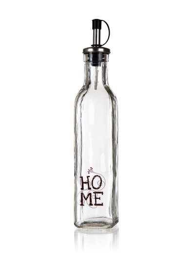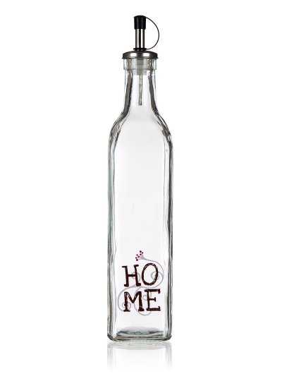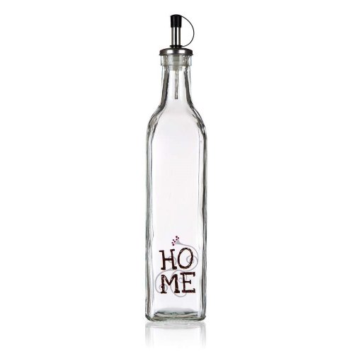 Láhev na olej s dekorem HOME hranatého tvaru, vyrobená ze skla, je ideální pomocník do kuchyně. Láhev je opatřena kovovou nálevkou s plastovým uzávěrem a těsněním, díky tomu bude práce s olejem daleko snazší.