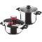 Sada tlakových hrnců 4 + 7l . Tlakový hrnec je vyroben z prvotřídní nerezavějící oceli 18/10 a velmi odolného plastu. Snadná manipulace otevření víka jednou rukou. Využitím regulace tlaku lze připravit velmi šetrně, rychle a chutně jakýkoli pokrm. Tlakový hrnec je vybaven indikátorem tlaku, dvojím bezpečnostním ventilem a bezpečnostním okénkem, pojistkou proti přetlaku a masivními držadly pro snadnou manipulaci, která nepálí. Designový tlakový hrnec se sendvičových dnem je určen pro všechny typy sporáků včetně indukčního. Součástí setu skleněná poklice.