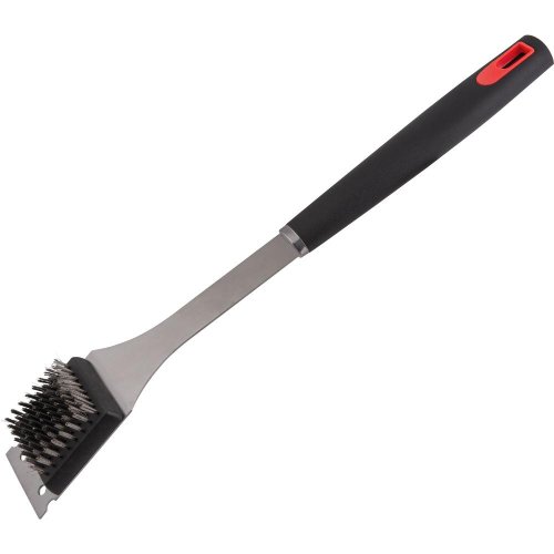 Kartáč na gril obsahuje ocelové štětiny, nerezovou škrabku Měkčená rukojeť pro pohodlnou práci Konec rukojeti má háček pro zavěšení