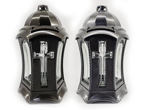 Hřbitovní lampa v podobě lucerny kombinuje materiály sklo a plast. Je robustní a dozdobena bílým křížem. V lampičce je vyměnitelná náplň. Hmotnost náplně: 110 g. Doba hoření: 40 hodin. Rozměry: průměr 17 cm, výška 27 cm. Barva: mix barev.