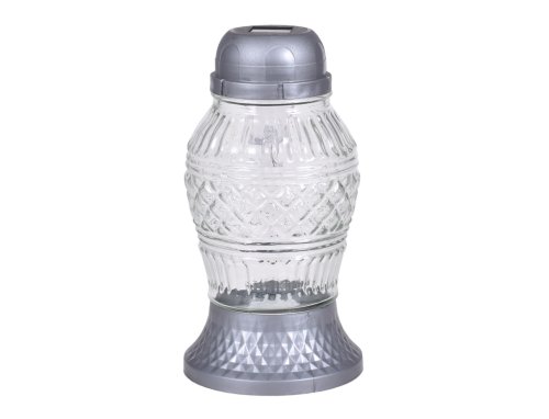 Skleněná hřbitovní lampa ve tvaru úzké lucerny s jemně profilovaným povrchem s motivy kosočtverců a pruhů. Sklo je čiré, doplněné o plastový podstavec a víčko ve stříbrné barvě. Ve víčku je zabudován solární panel se soumrakovým senzorem, který zajistí automatické rozsvícení po setmění. Díky solárnímu napájení odpadá nutnost výměny náplní, což zajišťuje pohodlné a dlouhodobé použití při dekoraci pietních míst. Rozměry: průměr 11 cm, výška 22 cm. Barva: stříbrná.
