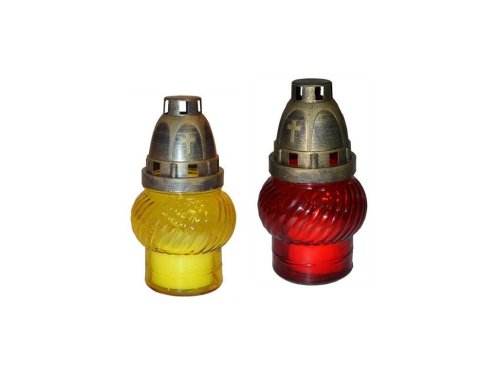 Skleněná hřbitovní lampa na svíčky s kuželovitým víkem proti dešti a proti uhašení plamínku větrem.