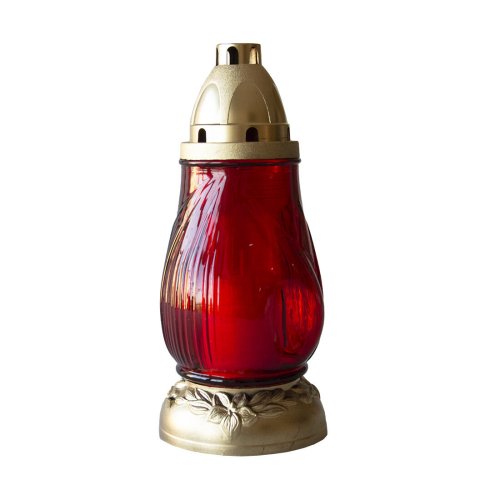 Skleněná hřbitovní lampa na svíčky 24 cm s kuželovitým víkem proti dešti a proti uhašení plamínku větrem.