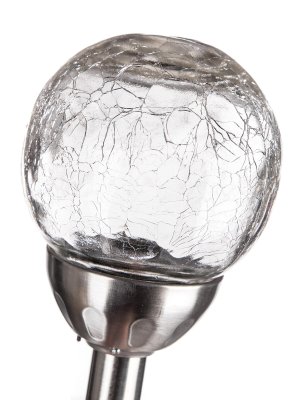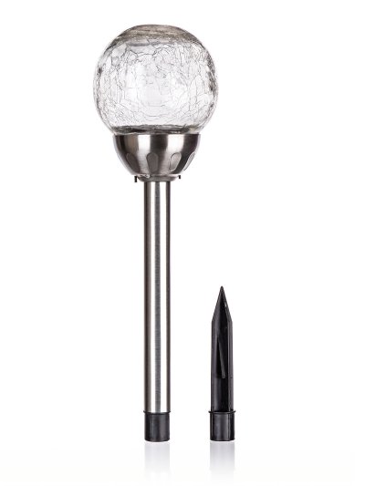 Lampa solární KOULE 10 cm, v. 38,5 cm, 2LED, čirá, popraskaná. rozměry (pr. x V): 10 x 38,5 cm Solární nerezová lampa o výšce 38,5 cm, se skleněným dekoračním stínidlem ve tvaru koule s pavučinovým dekorem …